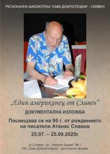 На 25 юли 2025г., в Регионална библиотека „Сава Доброплодни” – Сливен се открива документална изложба под надслов „Един американец от Сливен”, посветена на 95-годишнината от рождението на Атанас Славов – един от последните представители на интелектуалците енциклопедисти на 20 век – непримирим радетел за свобода на мисълта и словото, невероятен творец, учен, мислител, космополит, талантлив публицист, преводач, общественик. Изложбата е уредена в централното фоайе на библиотеката с продължение в литературния кабинет, в който писателят твореше в последните години от живота си и в който се съхраняват негови ръкописи, снимки, документи, пълна колекция от неговите книги и др.материали дарени на културната институция. В архива му има и солидна сбирка от материали върху живота на Учителя, теорията и практиката на дъновизма.