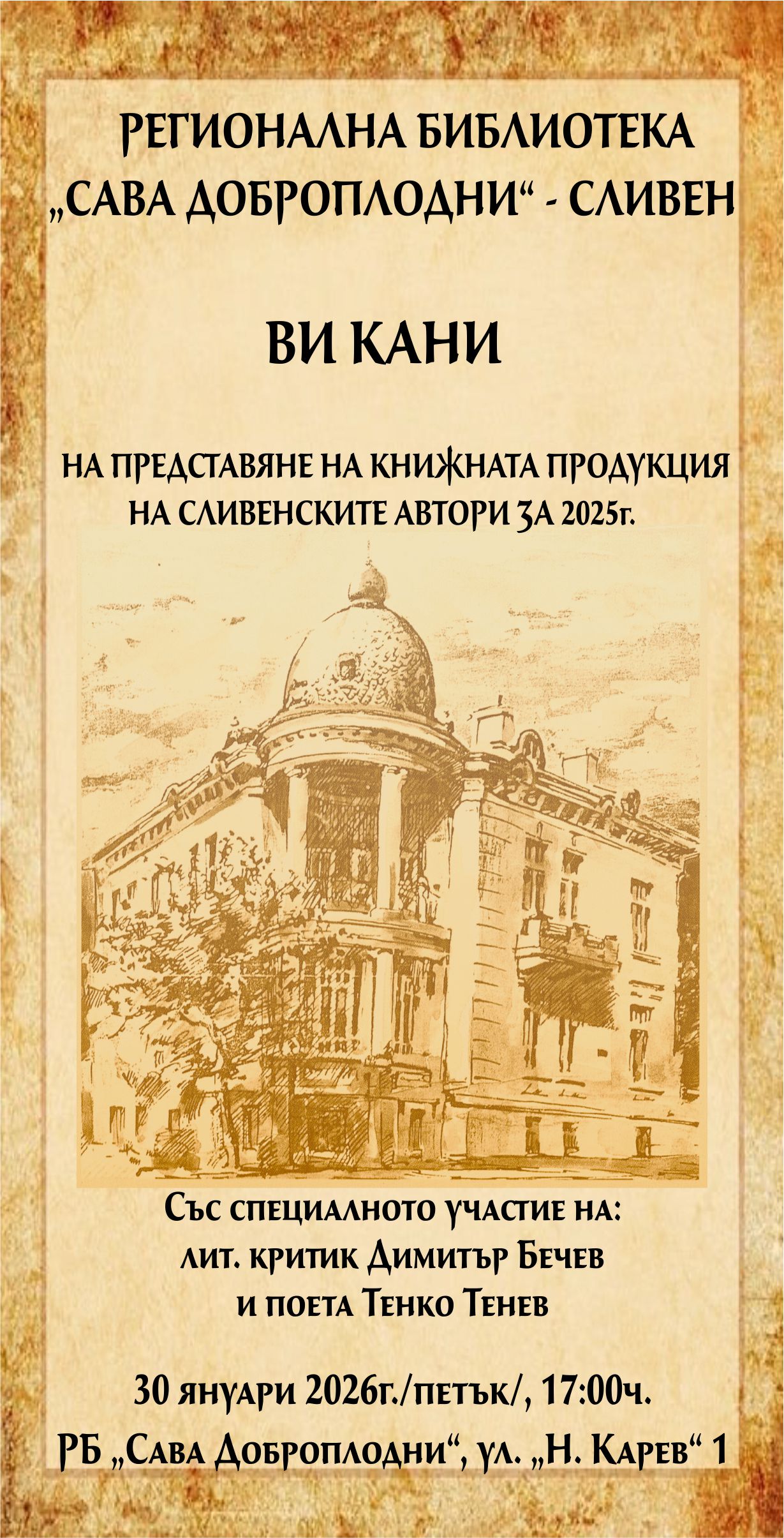 От 11 до 13 май 2026г., в гр. Сливен, по инициатива на Регионална библиотека „Сава Доброплодни” в партньорство с Министерството на културата, Община Сливен, Областна администрация – Сливен, Изпълнителна агенция за българите в чужбина, най-големите детски издателства и др., ще се проведе XXVIII Национален фестивал на детската книга – единственият форум в България посветен изцяло на детската книга, на проблемите свързани с нейното издаване, разпространение и четене в дигиталната епоха.